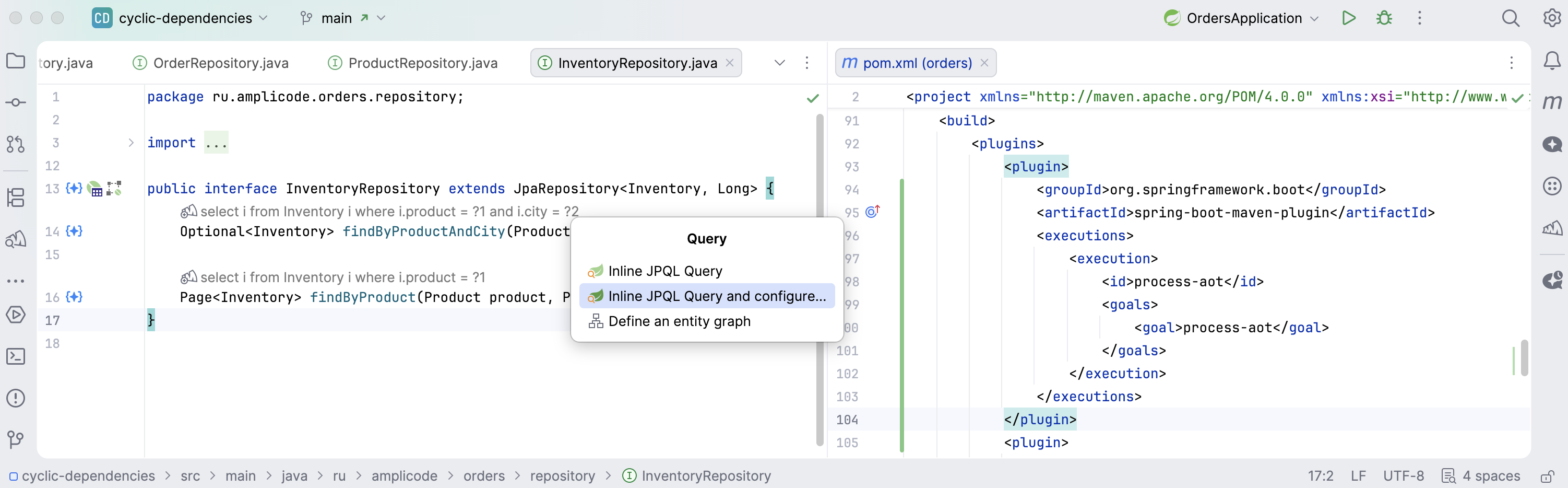 alwaysShowJpaQuery. Клик открывает меню: извлечь JPQL в аннотацию, настроить, определить Entity Graph.@Query.Если AOT-данных нет — хинт предлагает собрать проект.